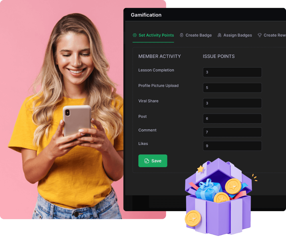 Choose to automatically build a dynamic, gamified AI community around your courses where members engage and win points that can go toward prizes and coupons.