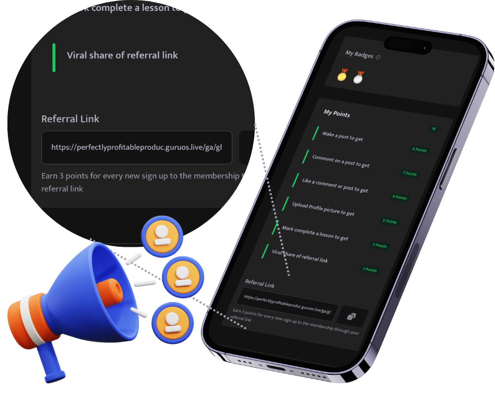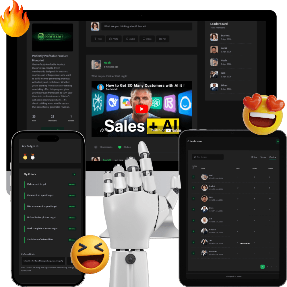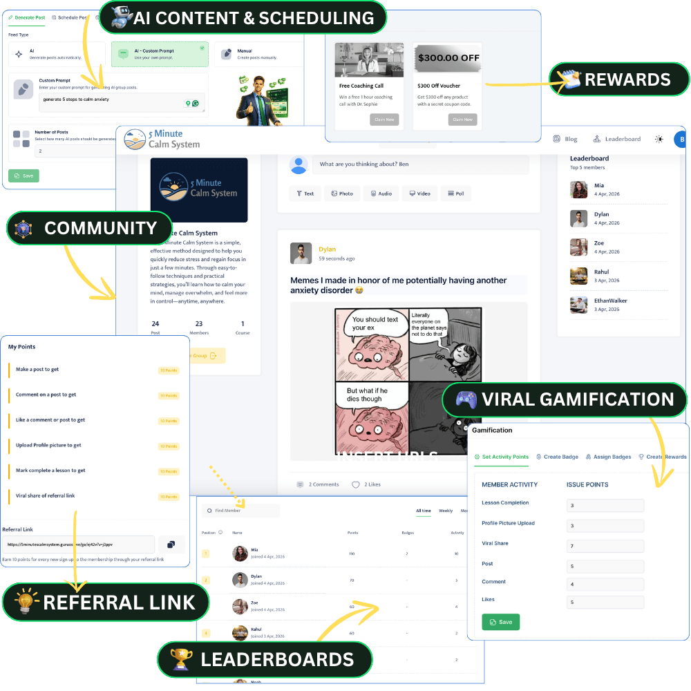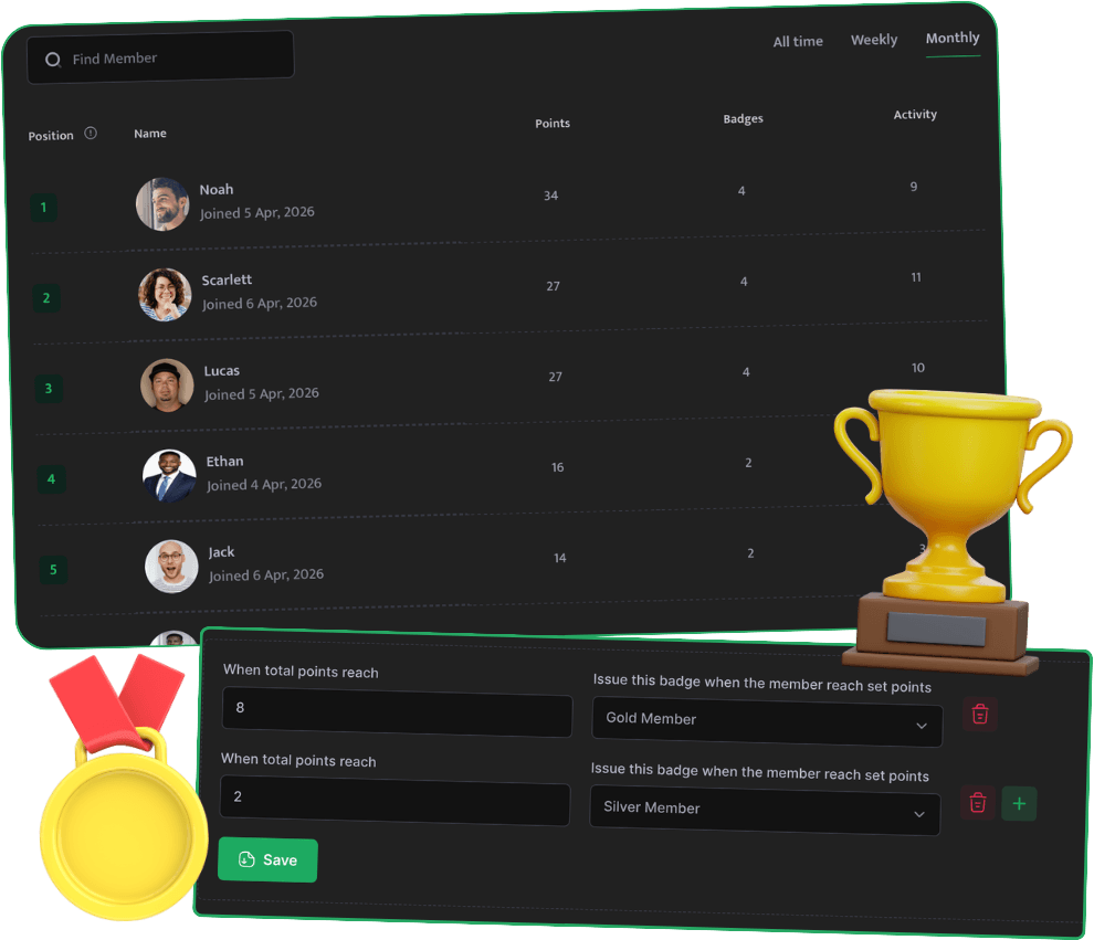 Let members compete on leaderboards, win badges, get AI content, even refer others for referral points that drive automatic leads so your communities profit, not just sit there.