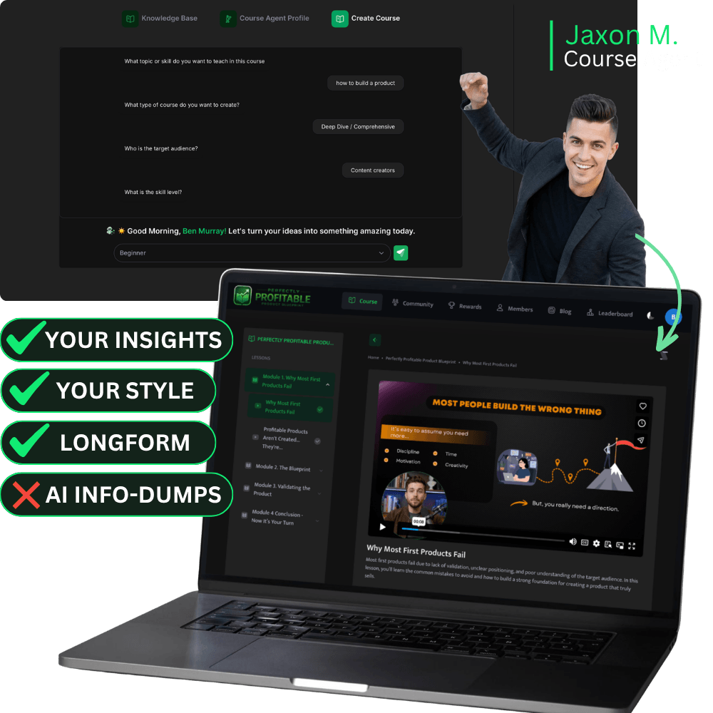 Then, special Course Agents combine their built-in expertise with your knowledge, voice, and frameworks to create high-quality video courses and eBooks that reflect your unique insights and brand from scratch.